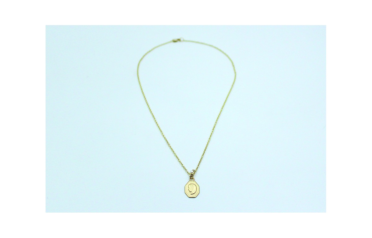 Solitario cadena eslabón pequeño oro mate con chapa virgen 17x11mm en oro mate y perla mini. Largo del collar 40cm.