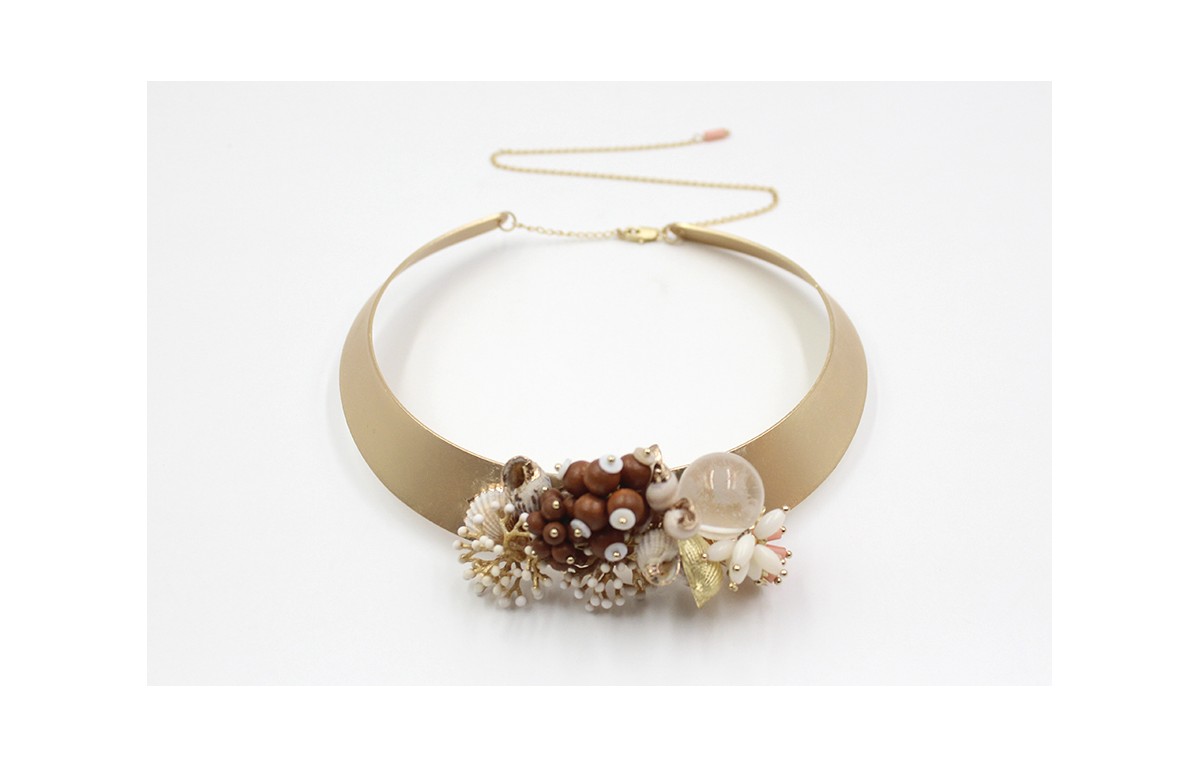 Collar rígido ancho con conchas y maderas, corales