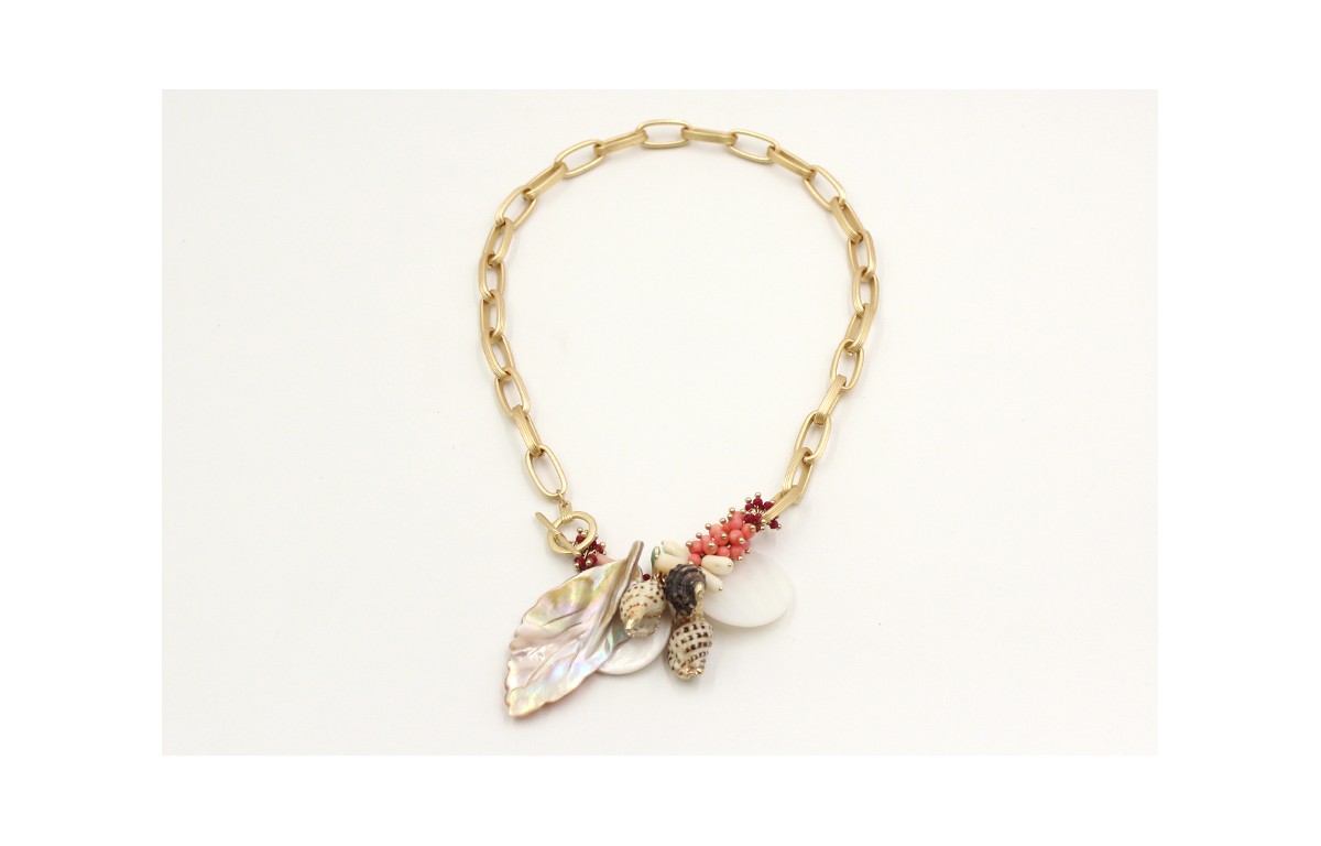 Gargantilla con cadena de eslabón grande en oro mate y centro con piezas de nacar, semipreciosas, caracolas. Largo 48cm.