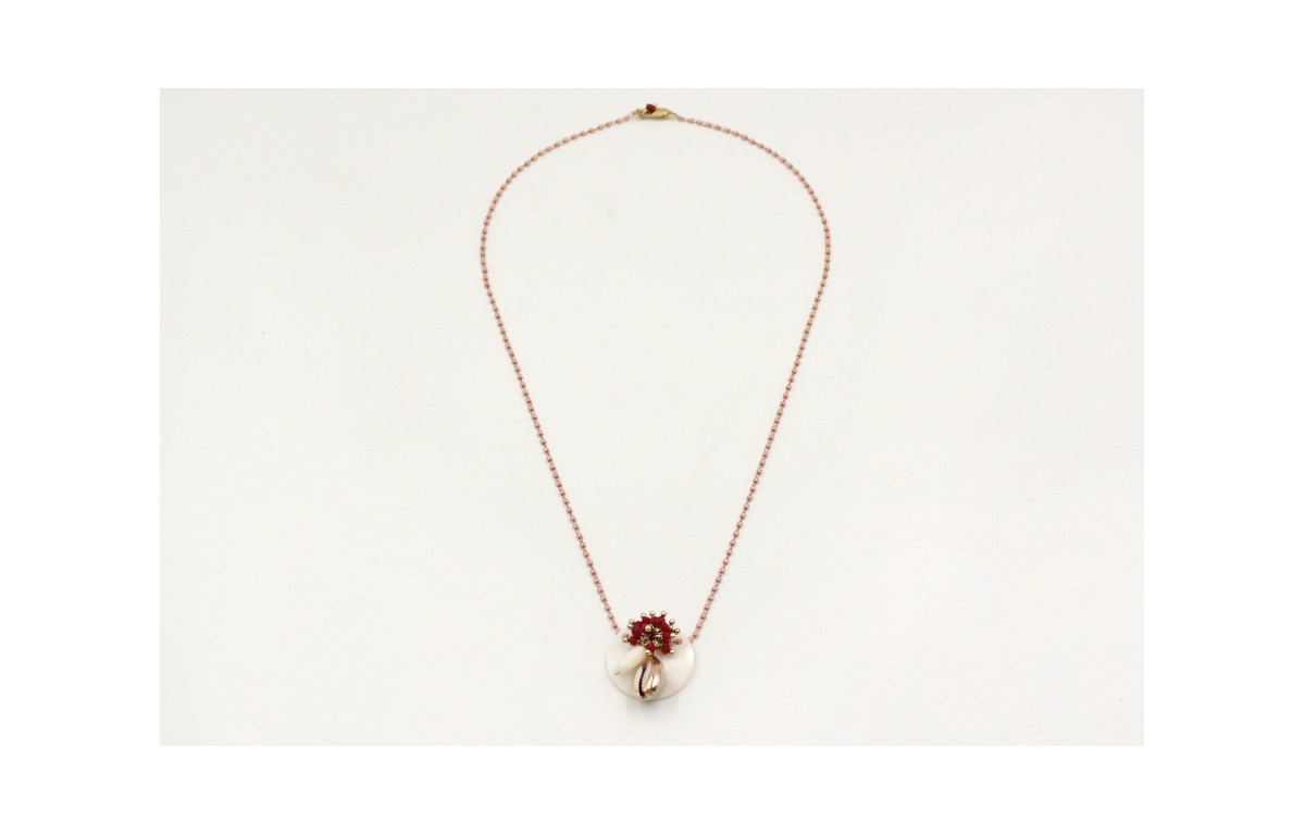 Gargantilla cadena de miyuki rosa con disco nacar, burruño facetadas granates, concha con borde dorado. Largo 52cm
