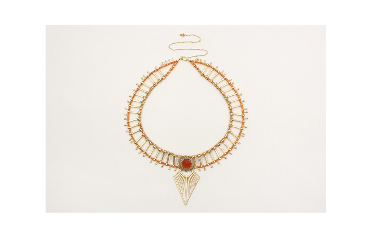 Gargantilla con coralitos entrepiezas en oro mate con pieza central brillo opal naranja y acabado en triangulo rayado. Largo 35cm mas cadena reguladora.