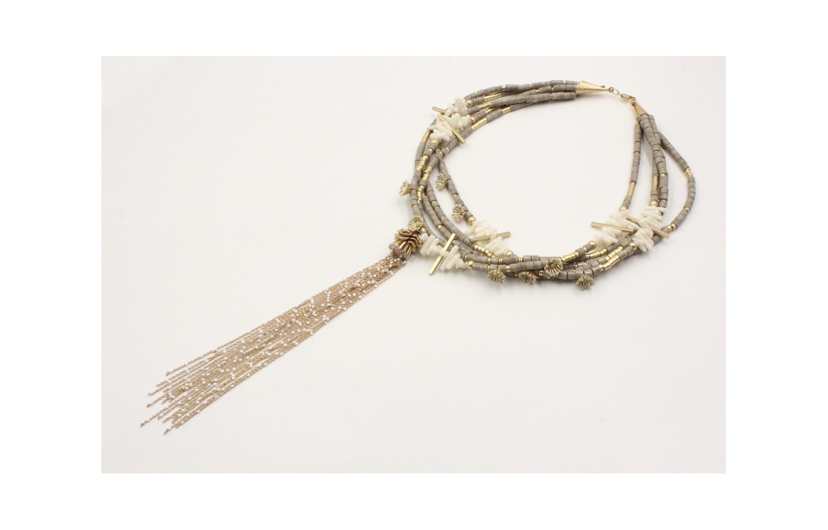 Collar de 5 vueltas con piedra color topo, corales blancos, flores oro mate y gris con fleco cadena bolita esmaltada blanca. Largo 66cm.