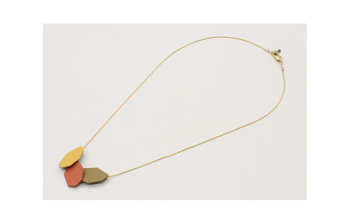 Collar con cadena fina oro brillo y tres piezas esmaltadas en coral, color huevo y visón. Largo 40cm