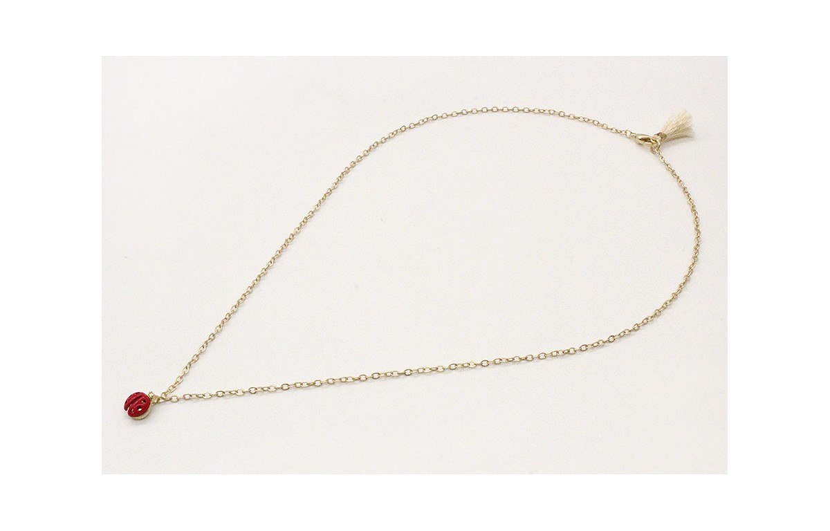 Solitario cadena eslabón pequeño en oro mate con mariquita roja rematado con micro-pompón beige. Largo 38cm.