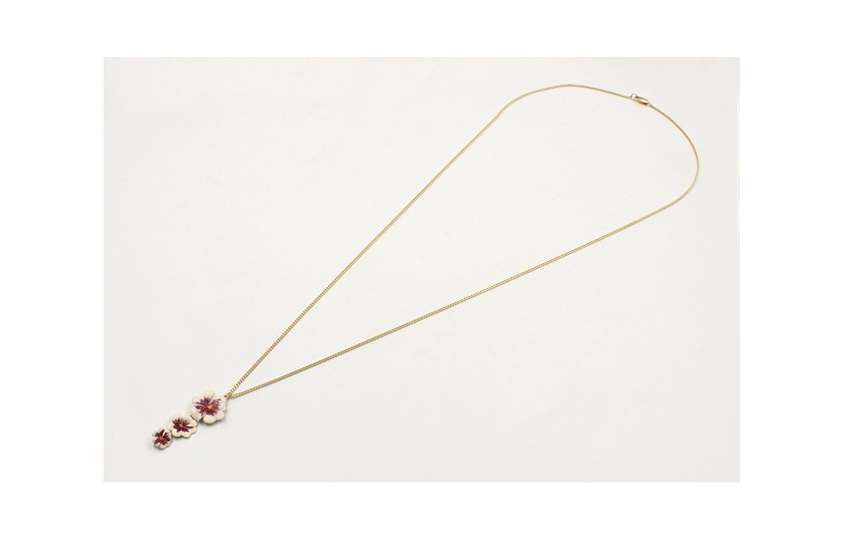 Solitario cadena eslabón plano oro mate con trio flores blanca y morada. Largo 77cm.