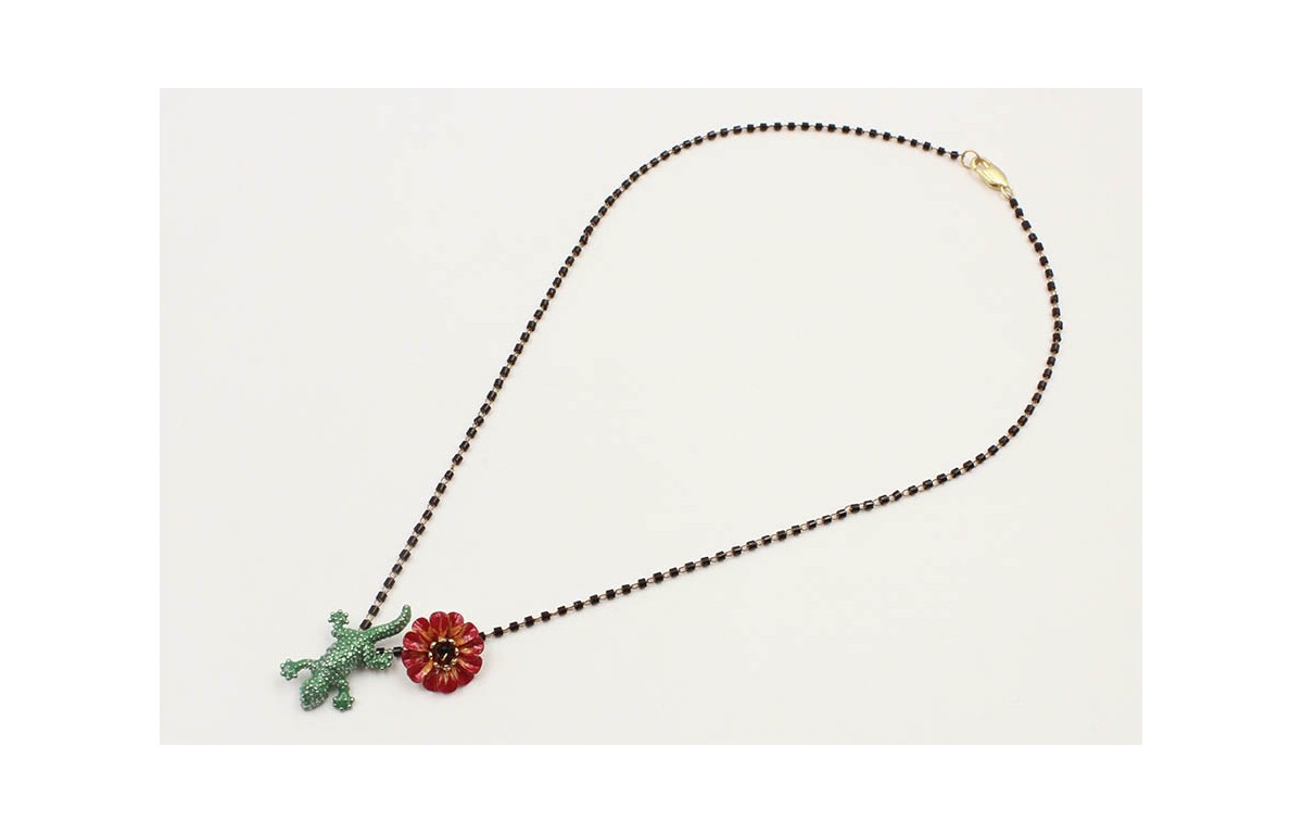 Collar cadena miyuki negra con colgante lagarto verde y flor esmaltada roja. Largo 43cm.