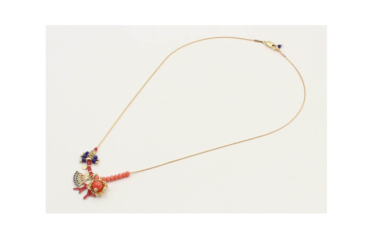 Collar cadena fina oro con facetadas coral, rama plana coral rojo,triangulo brillitos colores,facetadas azulones. Largo 41cm.