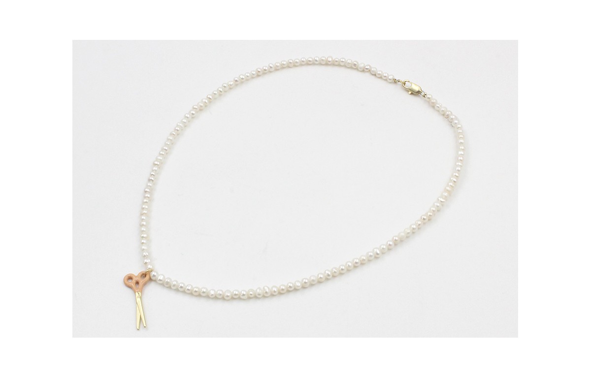 Collar con perlas y colgante tijera esmaltada rosa palo. Largo 41cm.