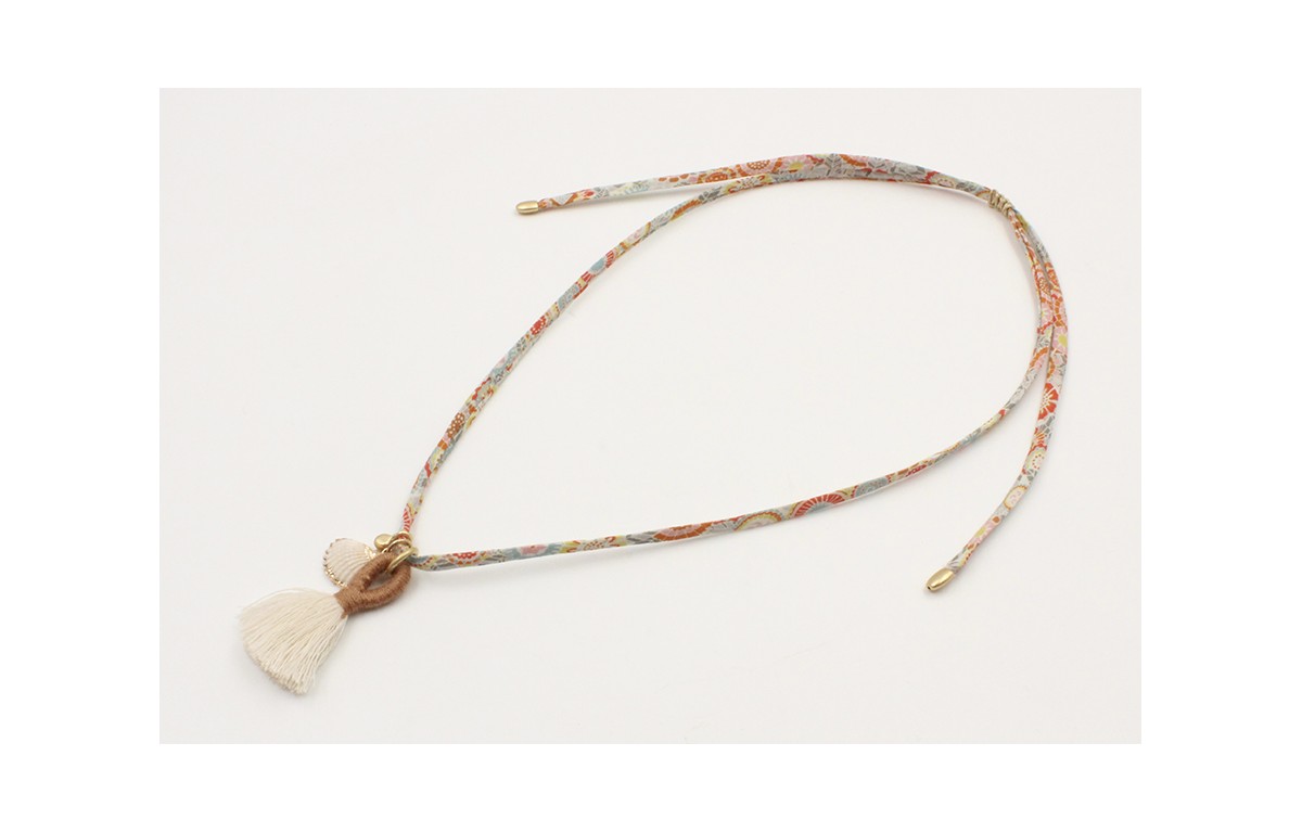 Collar lazo liberty naranja y turquesa con colgante concha borde dorado, pompon blanco y marrón, cubo oro mate. Es regulable.