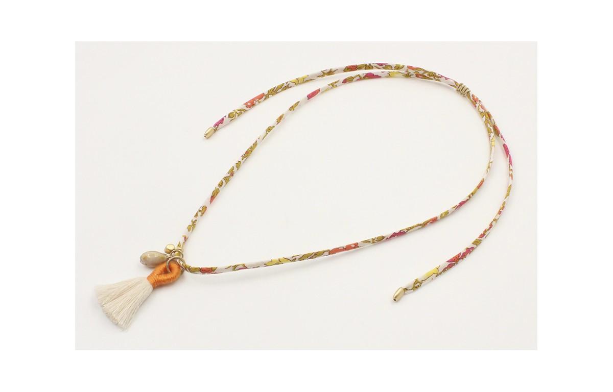 Collar lazo liberty flores verdes,rosas,coral con colgante caracola borde dorado, pompon blanco y mostaza, cubo oro mate. Es regulable.