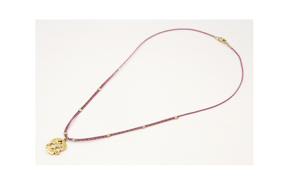 Solitario con hilo macrame rosa malva, mitad micro driza granate,oro con colgante calavera acero inoxidable brillos colores, tubitos aplastados. Largo 40cm.