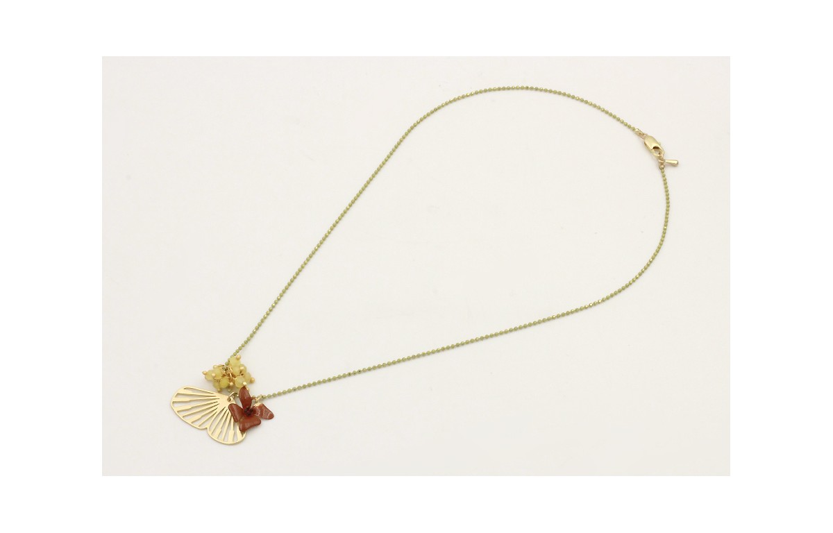 Collar cadena bolas esmalte verde pistacho, colgante ala dorada mate,flor esmalte teja y burruño semipreciosas lima. Largo 40cm.