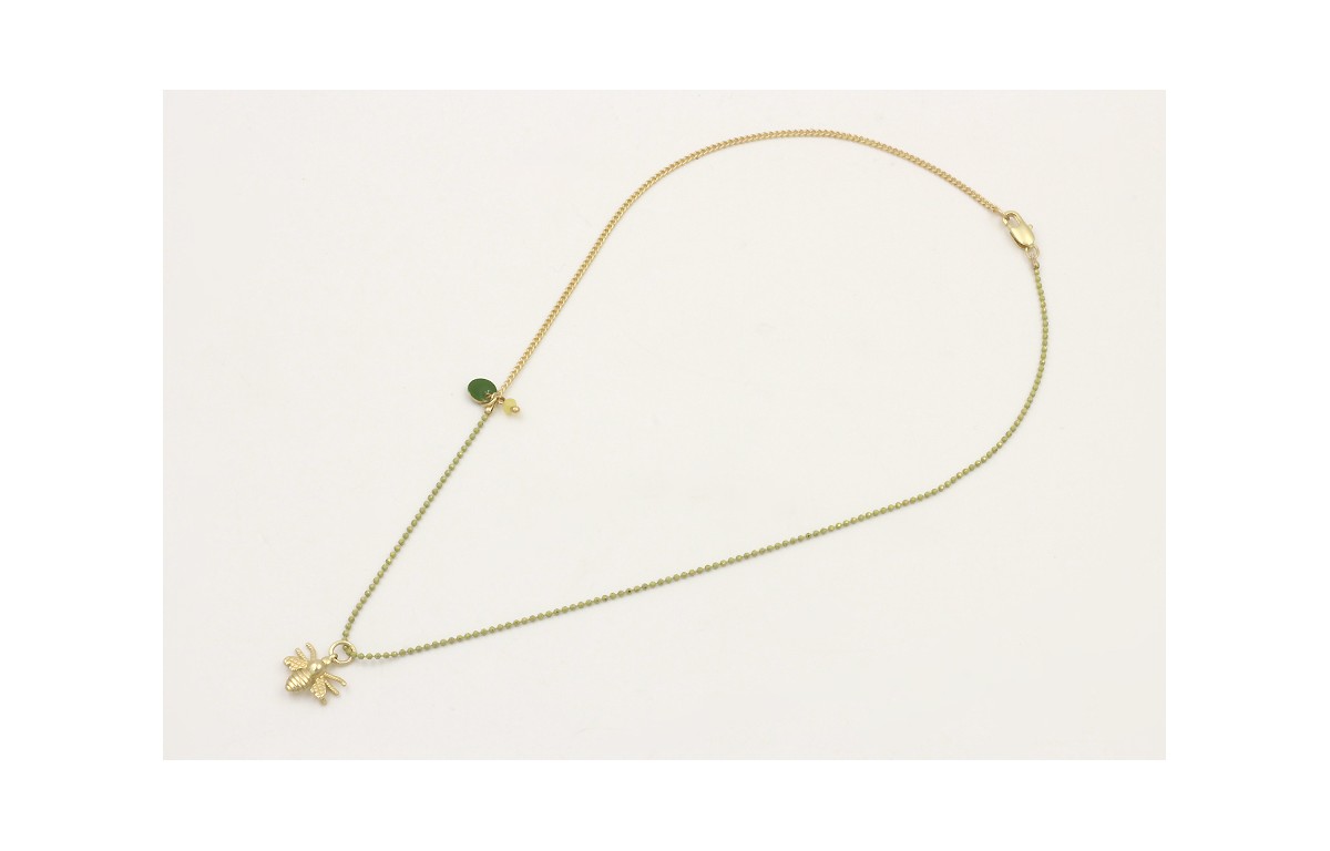 Collar de 2 cadenas una cadena bolas esmaltada pistacho y otro cadena eslabón plana, colgante abeja, esmalte verde y bola lima. Largo 40cm.