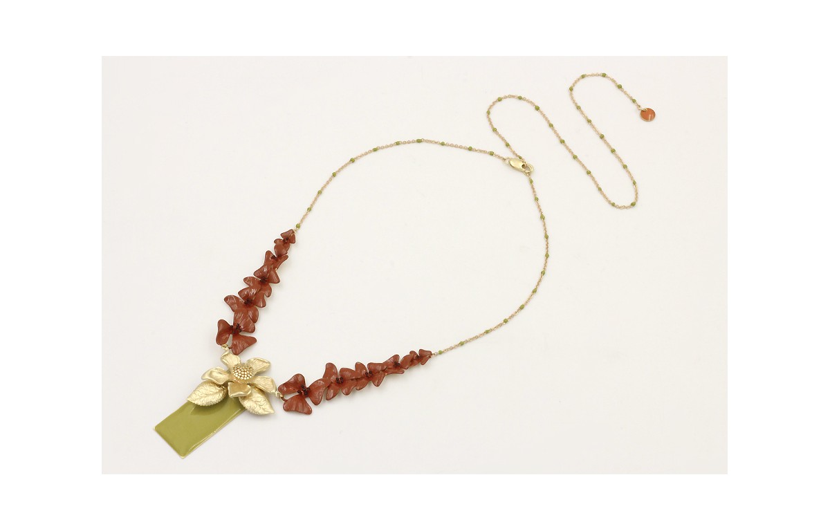 Collar cadena micro esmalte verde, colgante rectangular lima,hojas y flor dorada mate, tira 5 flores colore teja. Largo 38cm.