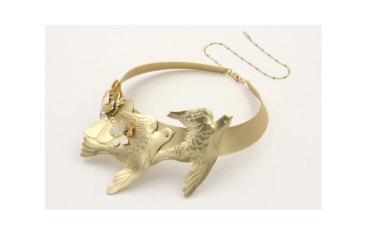 Collar rigido dorado mate con pajaros, mariposas,