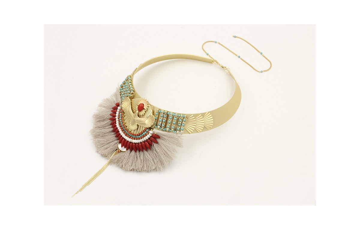 Collar rigido con centro sol,aguila,disco anudlado,pompones grises,strass coral, cuantas turquesas,coral y blancas, fleco cadena dorada mate, entrepiezas y triangulos ondulados.