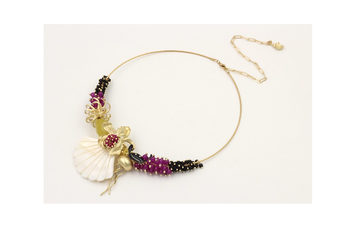 Collar rigido burruños abalorio negro y morado con colgante concha triangular nacar, medusa,bola tentaculos, flor dorada mate