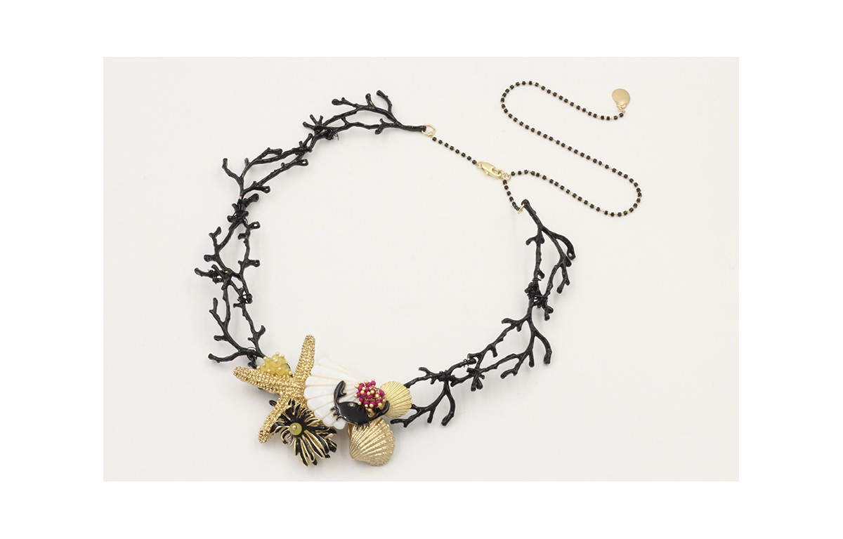 Collar ramas de coral esmaltadas negras con estrella de mar, almejas, concha triangular nacar, nenufar y camgrejo esmaltados negros y burruño abalorio morado. Largo 40cm.