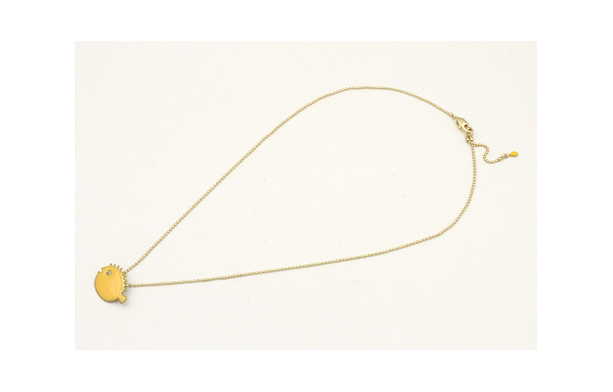 Solitario cadena bolas dorado mate con colgante pez globo esmaltado amarillo. Largo 38cm.