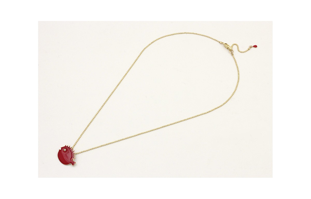 Solitario cadena bolas dorado mate con colgante pez globo esmaltado rojo. Largo 38cm.