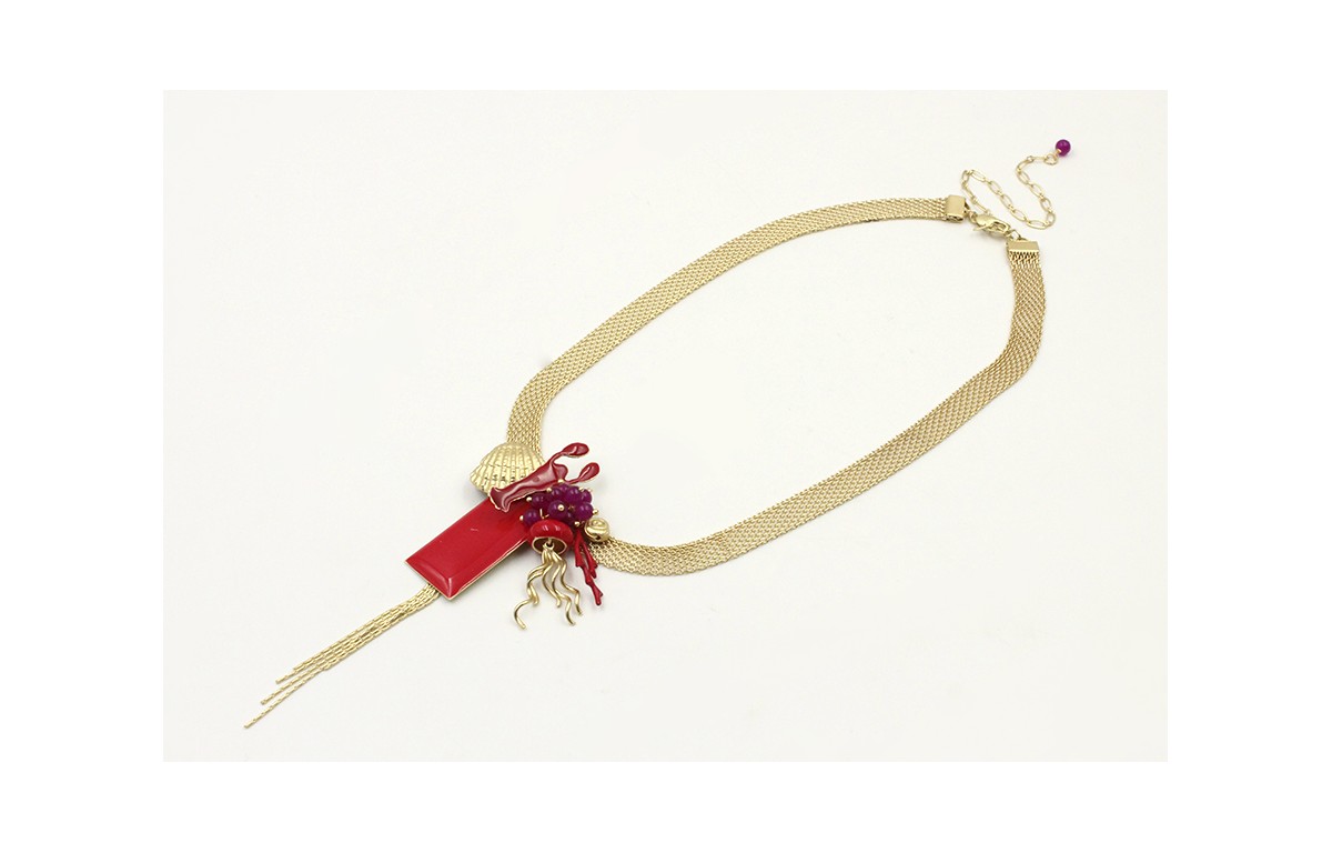 Collar cadena plana dorada mate con rectangulo esmaltado rojo, concha dorada mate, coral,langosta y medusas esmaltadas roja con burruño bolas moradas. Es regulable