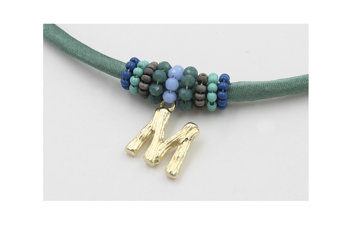 Collar seda verde con aritos de abalorio azul,turquesa,gris metalizado y facetadas azul clarito y azul petrolio con letra M,rematado cadena de eslabón ovalado dorado mate. Es regulable
