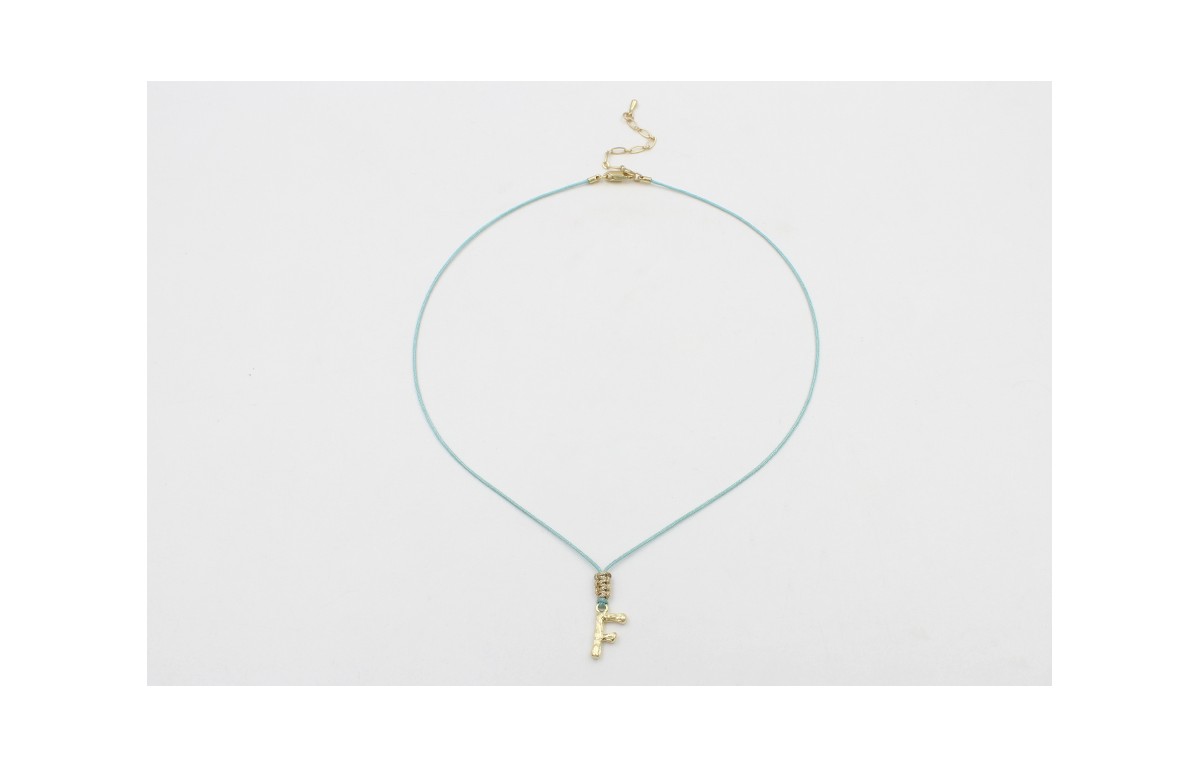 Collar hilo color menta con nudo macramé dorado palido y colgante letra F rematado con cadena ovalos dorado mate. Es regulable.