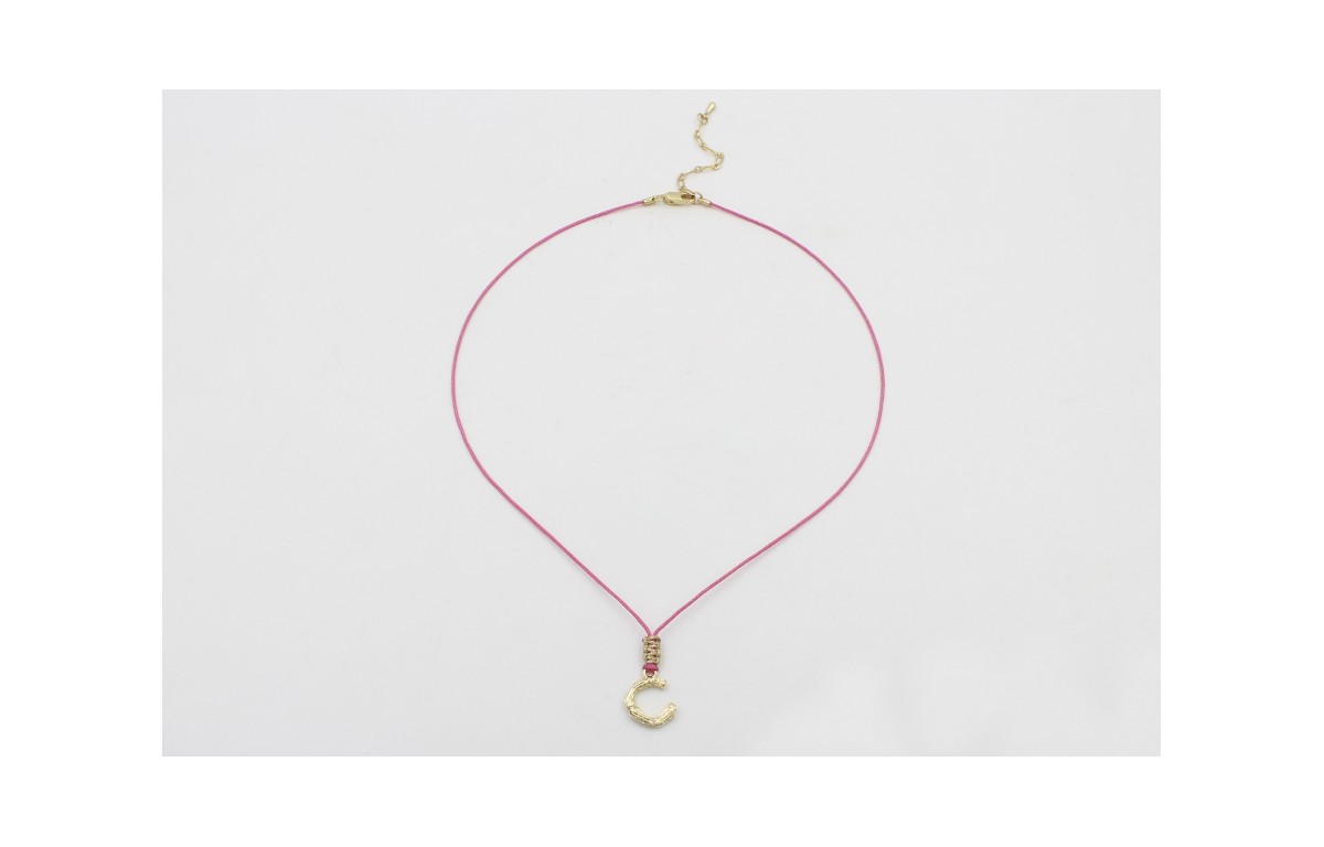 Collar hilo color rosa con nudo macramé dorado palido y colgante letra C rematado con cadena ovalos dorado mate. Es regulable.