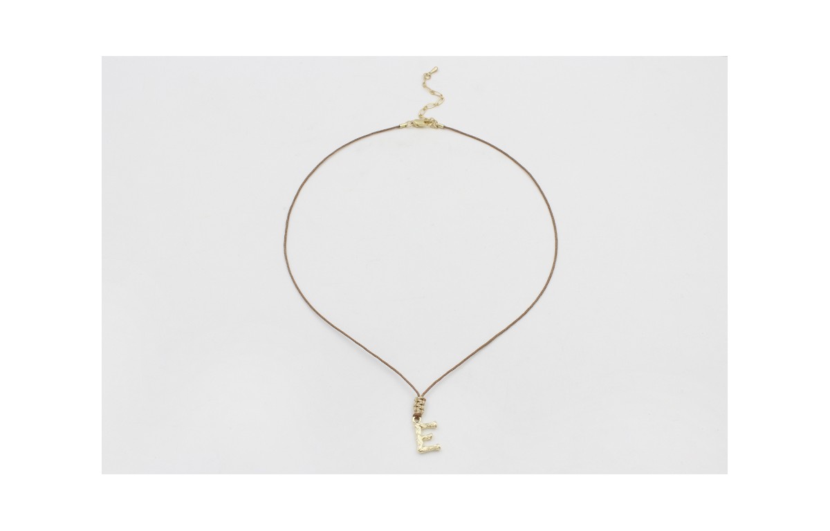 Collar hilo color marrón claro con nudo macramé dorado palido y colgante letra E rematado con cadena ovalos dorado mate. Es regulable.