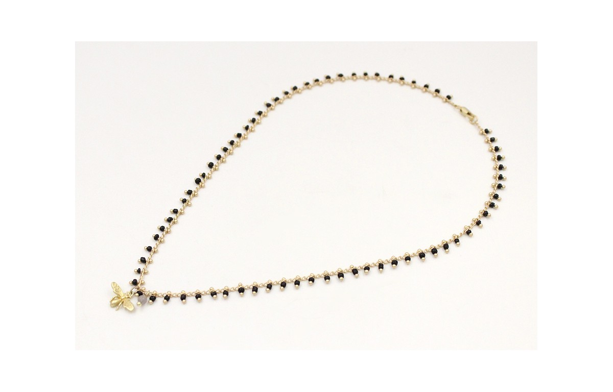 Collar de cadena con abalorio negro colgante de abeja oro mate y bolita gris. Largo 40cm.