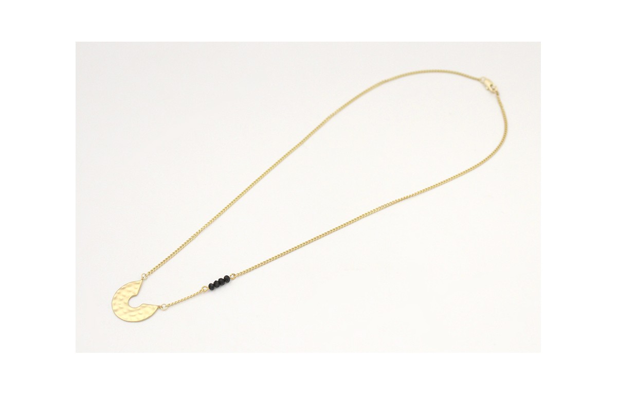 Collar cadena eslabón plano oro mate con colgante semicirculo labrado y facetadas negras. Largo 42cm.