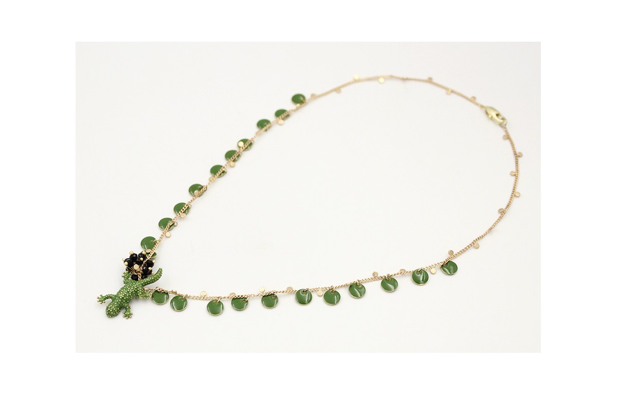 Collar cadena con chapitas oro mate, esmaltes verdes colgando con lagarto esmaltado verde y burruño de facetadas negras. Largo 40cm.