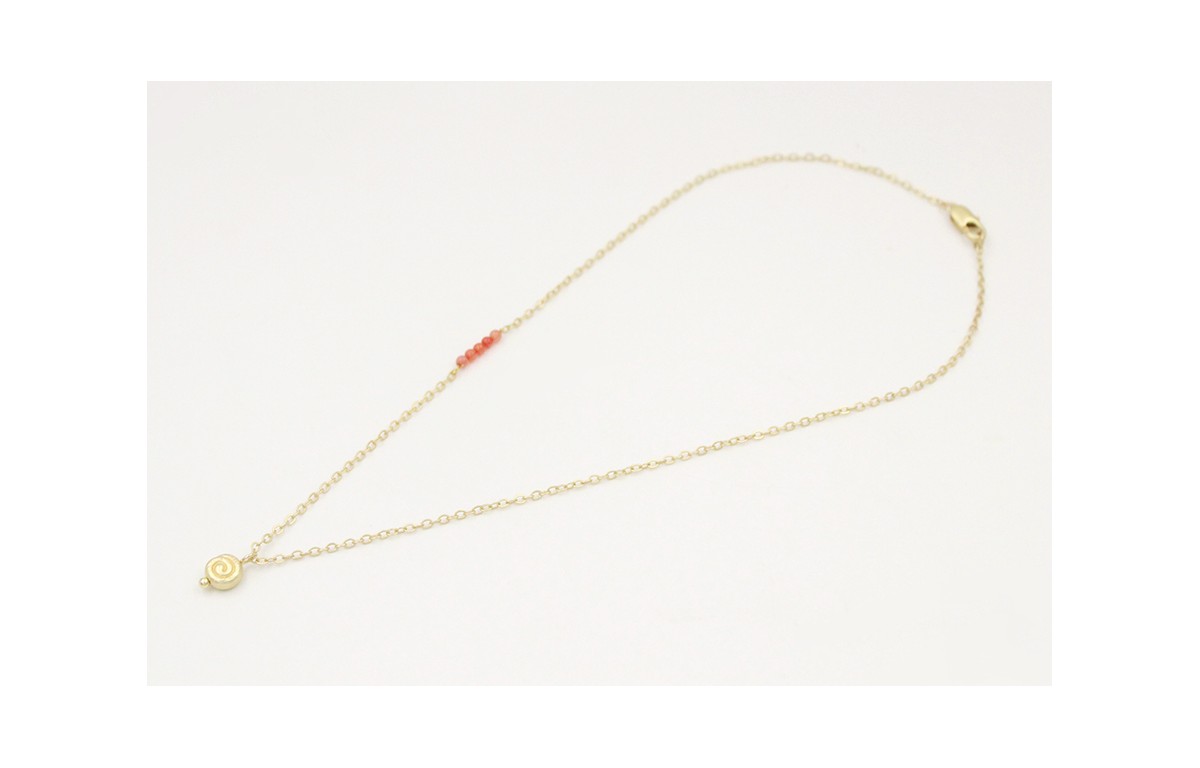 Solitario cadena eslabón pequeño en oro mate con semipreciosas rojas y colgante de caracolillo oro mate. Largo 40cm.
