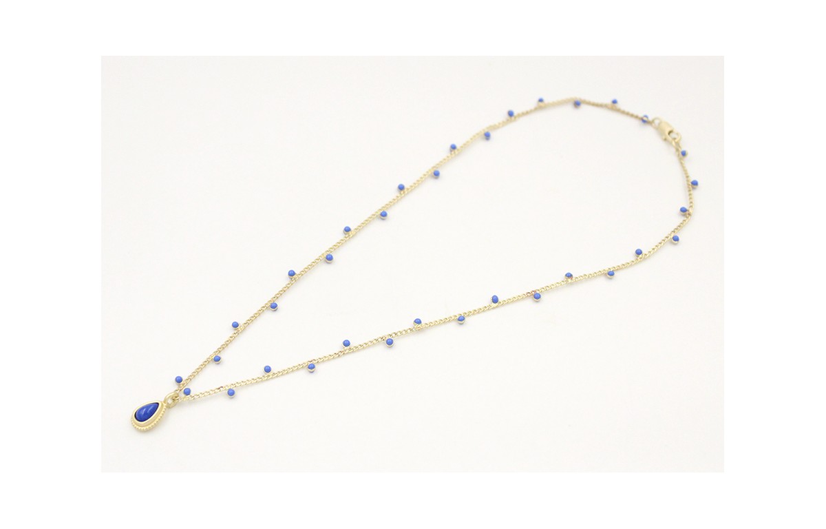Solitario cadena chapitas esmaltadas azules con colgante gota piedra azul. Largo 40cm.