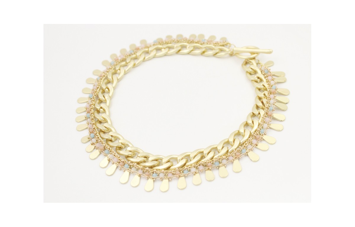 Collar triple con cadena entrelazada, cadena gotas en oro mate y cadena facetadas opales cosida. Largo 44cm.