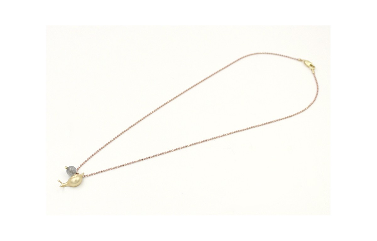 Solitario cadena de bolitas rosa nude con colgante caracol y bola gris. Largo 40cm.