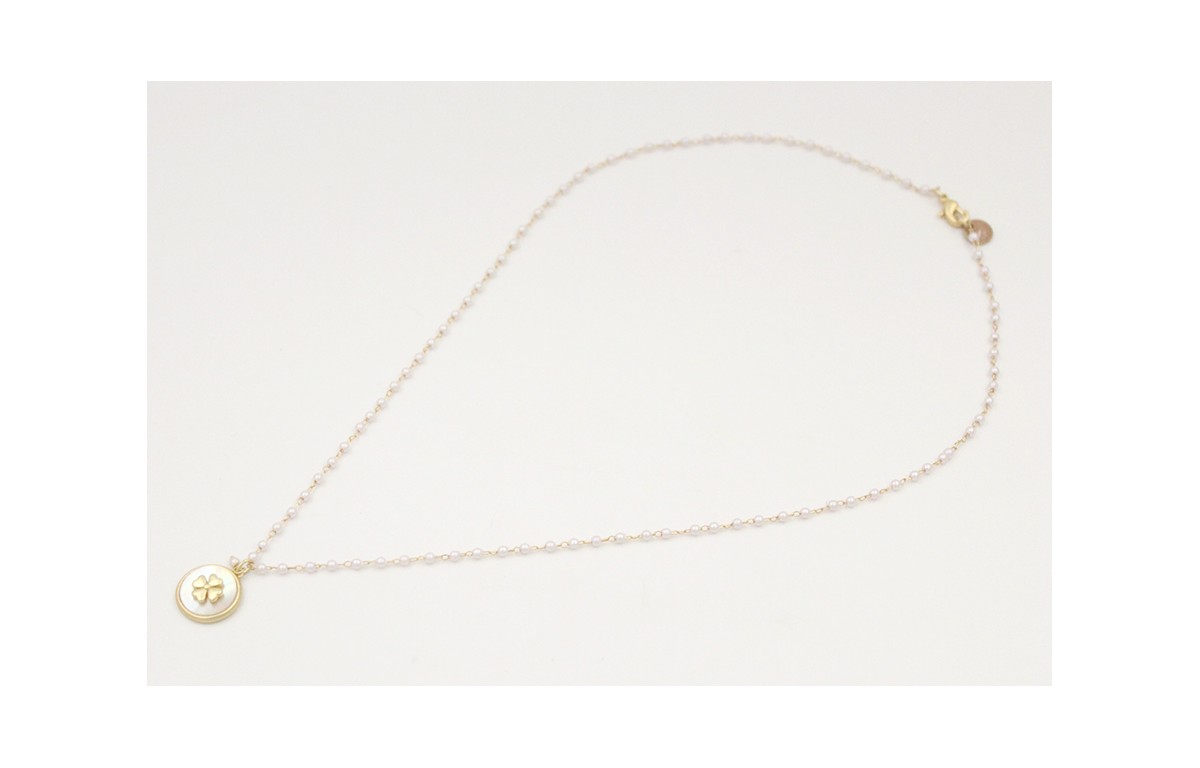 Collar cadena dorada con microperla y colgante disco dorado mate con nacar engarzado flor rematado con esmalte visón. Largo 42cm.