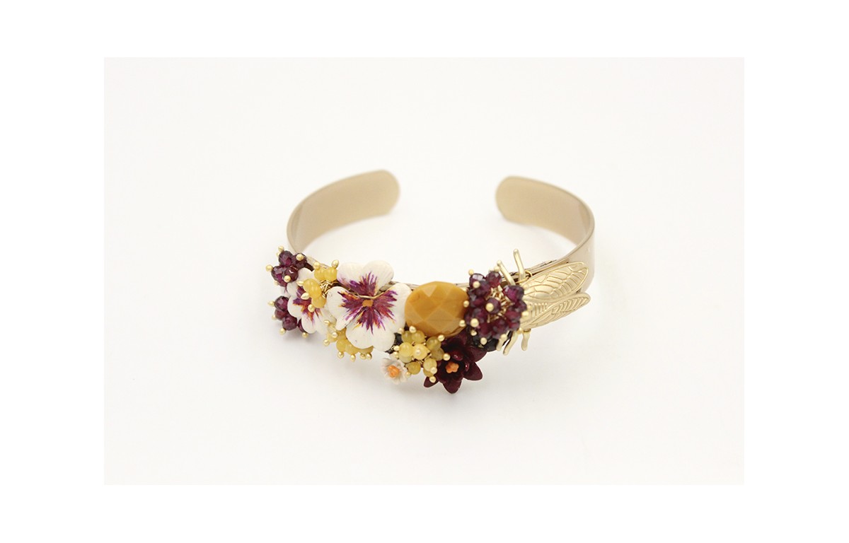 Pulsera rigida con cigarra oromate burruños de facetadas moradas y bolas amarillas con flores esmaltadas a mano y brillo mostaza.