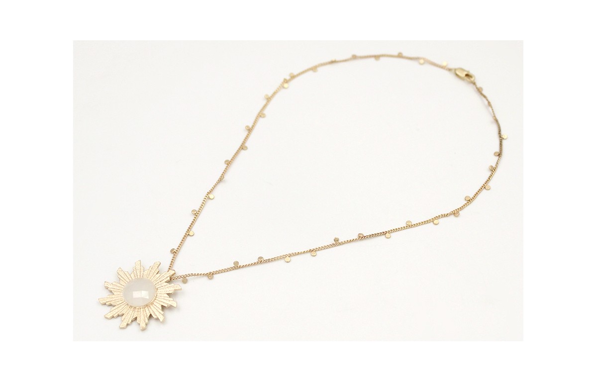 Solitario de cadena con chapitas colgantes oro mate y colgante sol estriado doraco con brillo blanco opal. Largo 40cm.