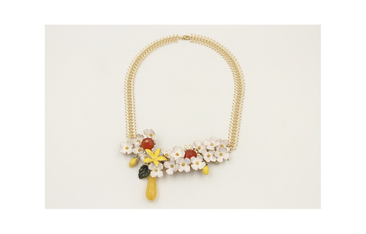 Collar cadena espiga dorado brillo, rama coral con flores esmaltadas blancas,brillos naranja opal, flor amarilla, hoja verde y limones esmaltados amarillo. Largo 40cm.