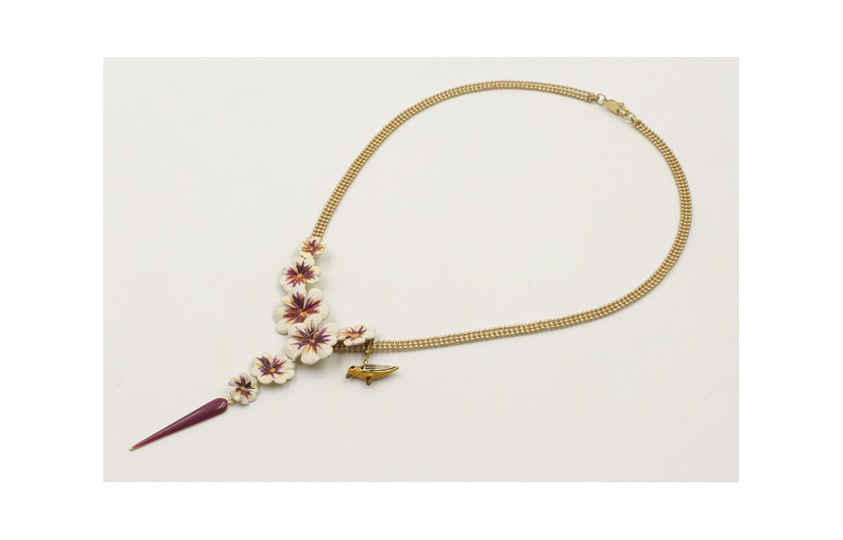 Collar cadena bolas 3 bandas dorada mate con flores blanca,naranja,morada, pajarillo amarillo y negro con cuña esmaltada cardenal. Largo 44cm.