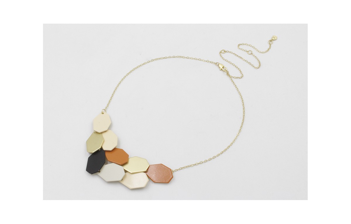 Collar babero de cadena de eslabón doarado mate con hexágonos beige,teja,negro y dorado. Largo 41cm.