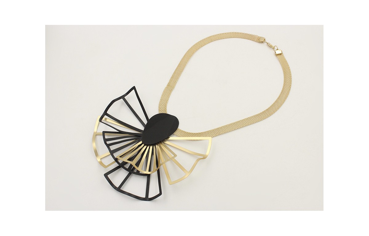 Collar cadena tira dorada mate con láminas abanicos esmaltados negro mate y dorado mate. Largo 8cm.