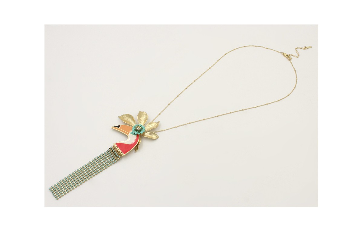 Colgante de cadena oro mate con microbolas, flor oro mate y colgante tucan esmaltado coral con flecos de cadena strass turquesa. Largo 55cm.