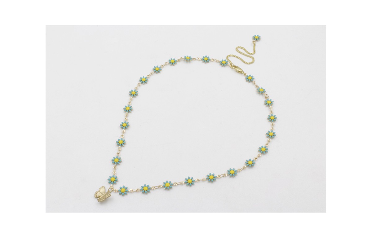 Colgante de cadena de margaritas esmaltadasturquesa con cadena alargadora de eslabón plano oro mate y colgante de mariposa oro mate. Largo 38cm.