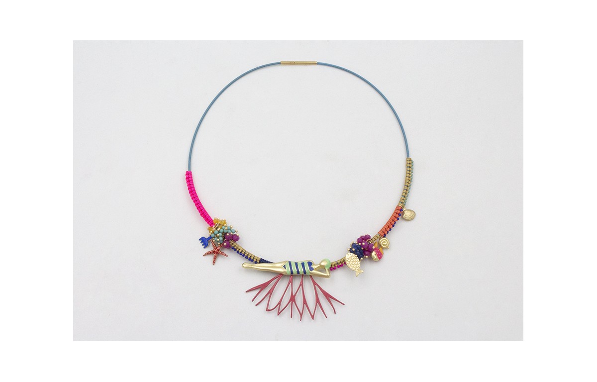 Collar rigido azul con bañista azul,rama coral rosa,estrella roja, rastrillo azulón, pez fucsia,caracolas, nudos macrame fucsias, dorado,azul marino,teja y burruños bolas semipreciosas.