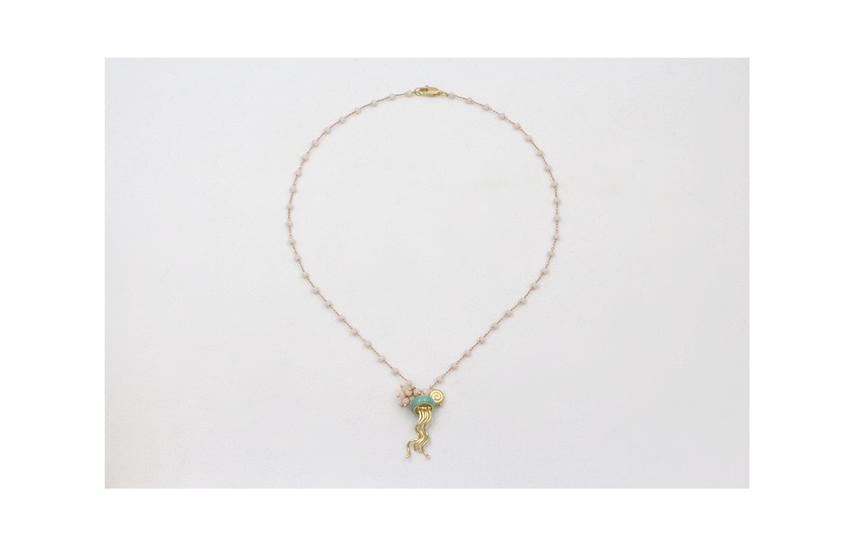 Collar cadena bolas facetadas opal con colgante medusa esmaltada turquesa, caracolillo dorado mate y burruño facetadas opal. Largo 40cm.
