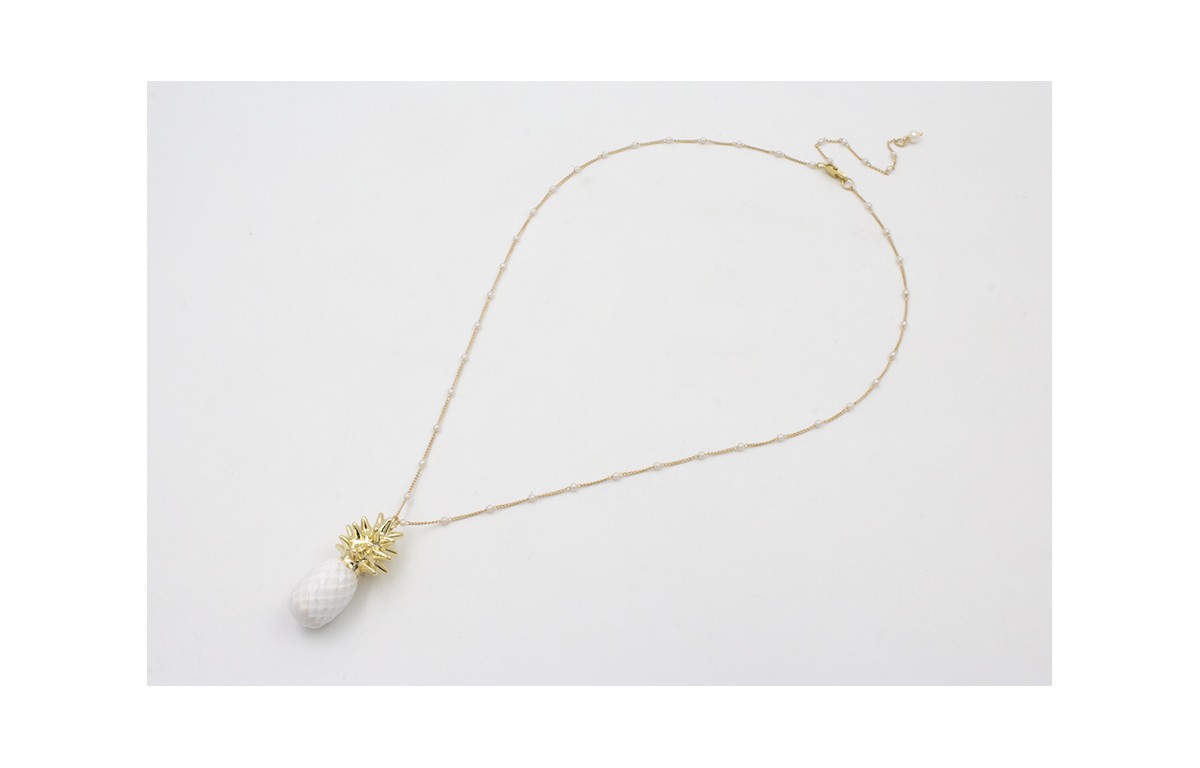 Collar cadena eslabón plano con perla intercalada y colgante de piña esmaltada blanca y oro. Largo 45cm.