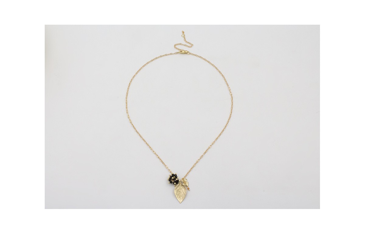 Collar cadena eslabón ovalado por partes doardo mate con hoja, flor y burruño de facetadas negras, rematada con cadena de eslabón retorcido.