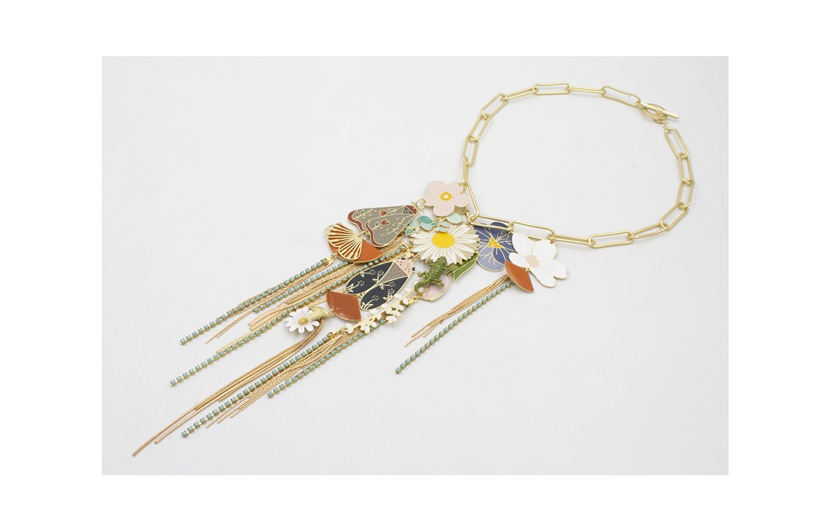 Collar cadena eslabón alargado grande con colgantes esmaltados, polilla, margarita, flor rosa, flor azul, flor blanca, ramas verde,azul, tulipan rosa con flecos cadena strass turquesa y dorado mate.